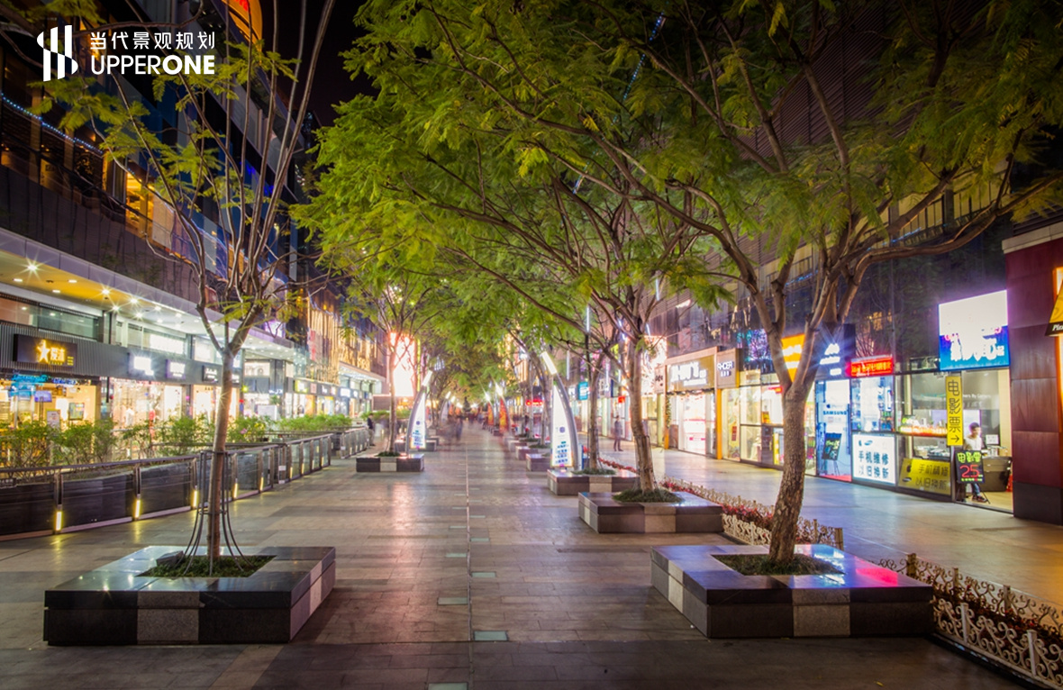 Shenzhen is a sunny city of its summer longer than other regions, so in the commercial space, green design is particularly important. In order to create a garden-style shopping experience for people, tall local species which does not affectcommercial view but also play a tree-lined shopping effect are selected. It is not just to solve distribution and other traffic problems but provide rest areas in the central square when people shopping. Hence, there are largestructures and tree-array spaces arranged for rest. It will strengthen interaction between persons and make them stay longerin the commercial area.