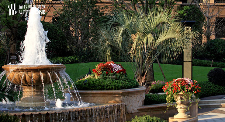 项目定位为新装饰主义高端住宅,基地地理位置优越交通便捷,项目采取酒店式入户设计,通过共享大堂进入住宅内部,同时引入人车分流的理念,景观设计强调空间与功能的均好性,所以景观规划出,“一心一环”的景观结构,一心是基地中心的公共的核心花园,一环是基地一周的环状绿化带。南侧景观布置大面积水景,使小区南北所有住户都能享受到水景,结合半地下车库设置的中央花园,当代景观规划主创设计师参与设计,园林创造出静怡高贵的居住环境。